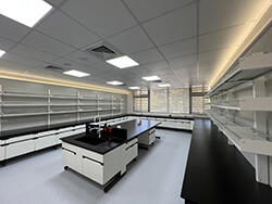 The lighting system is designed with LED panel lights and indirect lighting to ensure adequate task illumination while maintaining visual comfort. In addition, secondary electrical and plumbing works were completed to improve equipment operation and facilitate future maintenance. Overall, the project emphasizes practicality, safety, and efficient space integration, delivering a professional laboratory environment tailored to institutional needs.